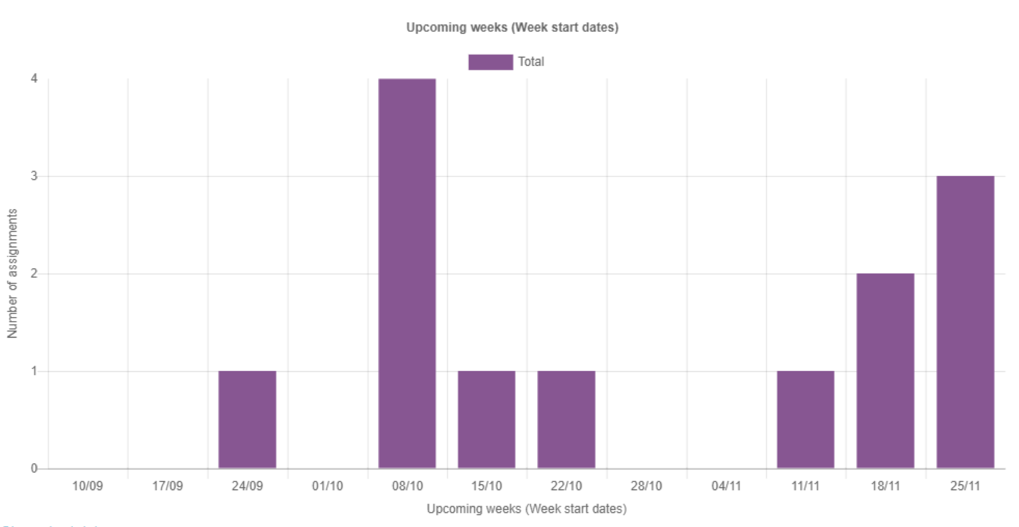A bar chart with the number of assignments across the next 12 weeks, presented on weekly basis.